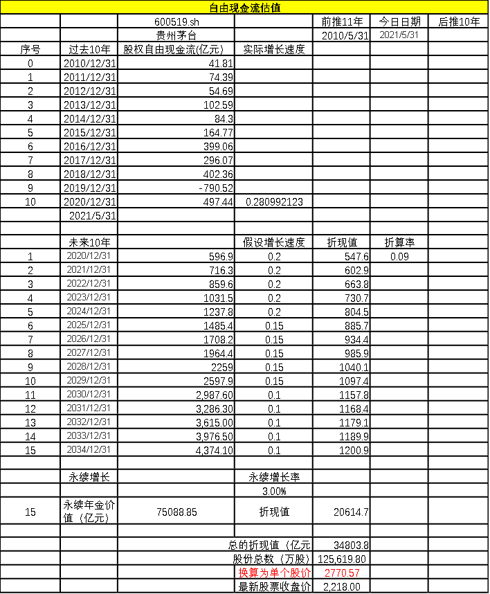 貴州茅臺全部內(nèi)在價(jià)值為3.48萬億元,折合單個(gè)股票價(jià)格為2770.57元,截止到2021年5月31日,貴州茅臺的收盤價(jià)為2218元,遠(yuǎn)遠(yuǎn)低于其內(nèi)在價(jià)值。