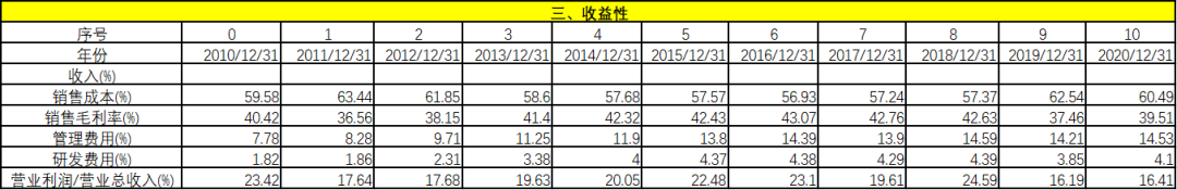 從收益性上看,管理費(fèi)率略有下降,對于股東來講,這是個(gè)好消息,該企業(yè)并沒有隨著銷售的增加給員工提升薪酬或者福利,值得信賴。研發(fā)費(fèi)用占比很低,對于酒類企業(yè),基本不需要研發(fā)。因此,研發(fā)費(fèi)用低并不影響未來的企業(yè)發(fā)展。營業(yè)利潤/營業(yè)總收入穩(wěn)步上漲。