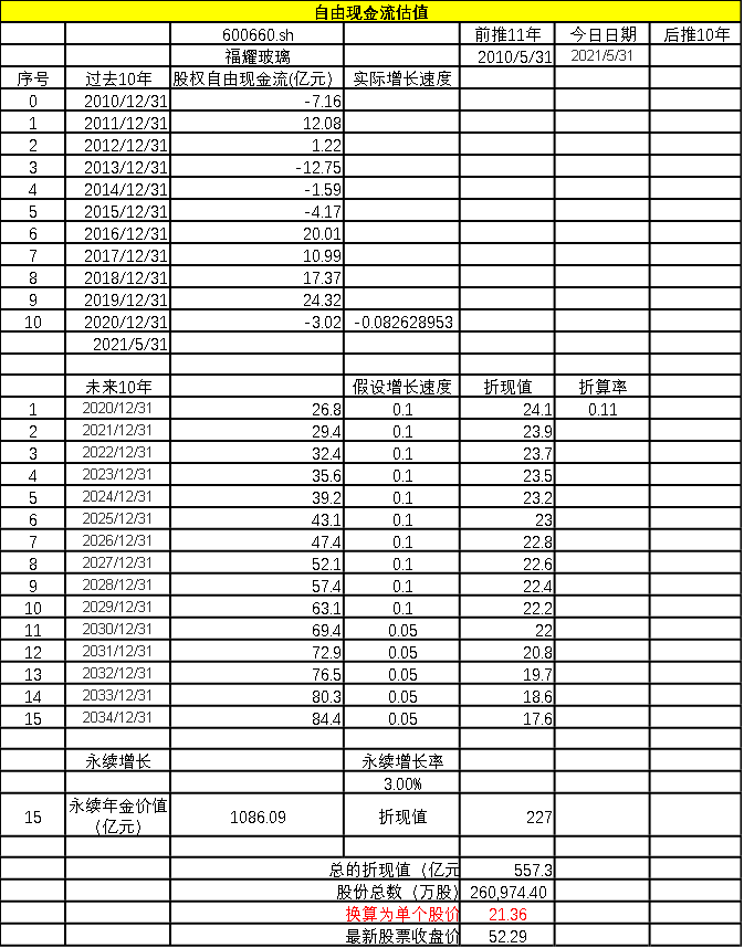雖然福耀玻璃名氣非常大,但自由現(xiàn)金流估值模型給出的總估值為557.33億元,換算成個(gè)股,股價(jià)為21.36元,低于2021年5月31日52.29元的收盤價(jià)。