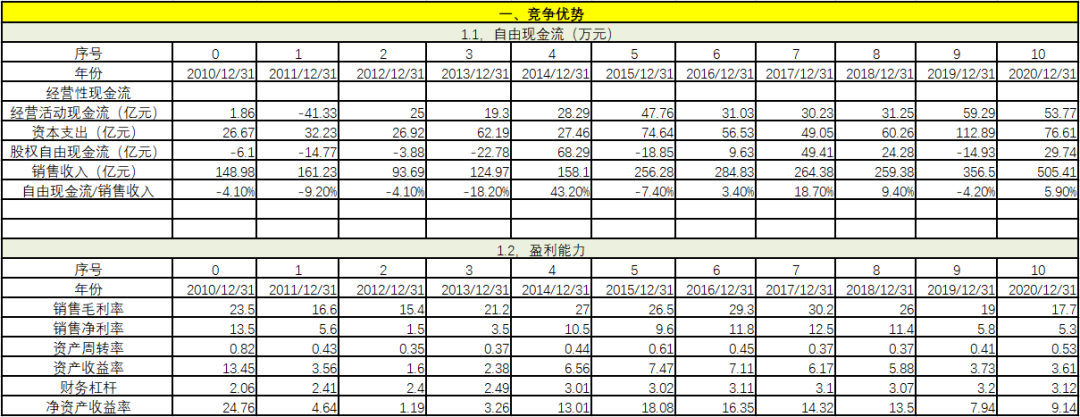 從競爭優(yōu)勢上看,自由現(xiàn)金流/銷售收入在過去11年中有6年為負(fù),并且僅有4年大于5%,經(jīng)營績效并不穩(wěn)健。相對于經(jīng)營活動現(xiàn)金流,資本開支過大,也就是說,企業(yè)自己的造血功能不足以支撐企業(yè)的長遠(yuǎn)發(fā)展,有一定的危險(xiǎn)性。