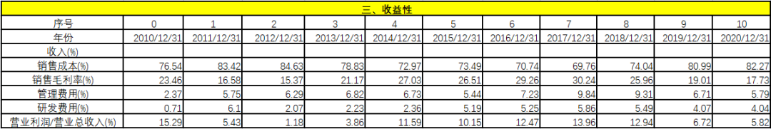 從收益性上看,管理費(fèi)率提升后有所壓縮,說明企業(yè)意識到非生產(chǎn)條線的薪酬增長過快,影響了利潤,因此有所壓降。研發(fā)費(fèi)用處于穩(wěn)定狀態(tài)。但,營業(yè)利潤/營業(yè)總收入近期下降得比較多。