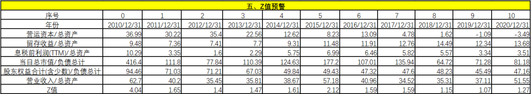 從財(cái)務(wù)困境模型上看,Z值用來分析預(yù)測企業(yè)財(cái)務(wù)失敗或破產(chǎn)的可能性,Z值越低,企業(yè)越有可能發(fā)生破產(chǎn)。通過計(jì)算某企業(yè)連續(xù)若干年的Z值可以發(fā)現(xiàn)企業(yè)是否存在財(cái)務(wù)危機(jī)的征兆,一般來說,當(dāng)Z值大于2.675時(shí),則表明企業(yè)的財(cái)務(wù)狀況良好,發(fā)生破產(chǎn)的可能性就小;當(dāng)Z值小于1.81時(shí),則表明企業(yè)潛伏著破產(chǎn)危機(jī);當(dāng)Z值介于1.81和2.675之間時(shí)被稱之為“灰色地帶”,說明企業(yè)的財(cái)務(wù)狀況極為不穩(wěn)定。