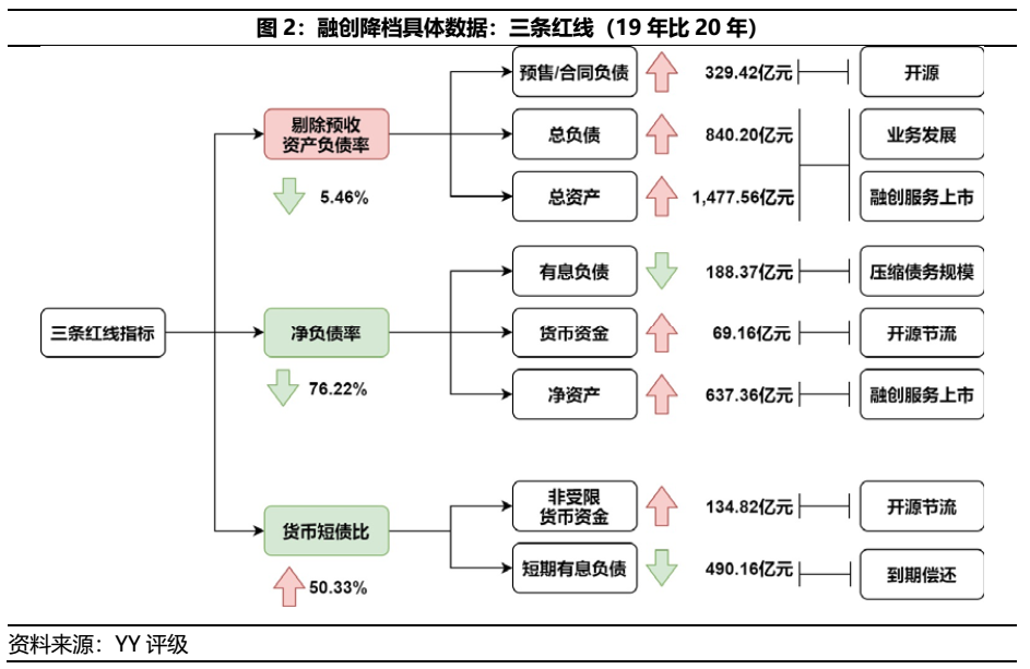 自19至20年之間,融創的三道紅線指標均有改善,除了依賴于融創服務上市外,加速去化并減少拿地亦是公司降杠桿的主力。順帶一提,從圖2也可看出,剔除資產負債率屬于三個指標最不易調整的指標,該指標體現了公司整體業務布局的激進程度(杠桿程度)。只要公司仍然利用杠桿進行擴張拿地,自黃檔晉升為綠檔的可能性仍較低,并不是單單利用加快去化得以調節的。