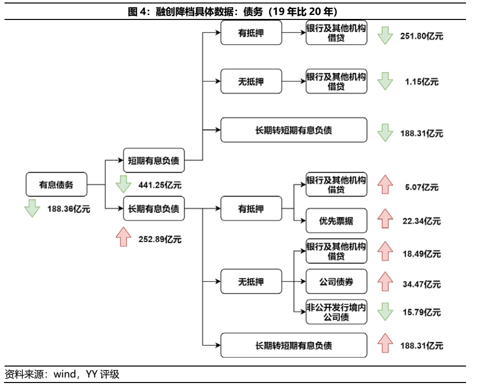 關于有息債務規模各類債務具體變化情況,以銀行及其他機構借貸融資渠道下降最大,20年末較19年末減少229.39億元的規模;非公開境內公司債券次之,減少了15.79億元;而公司債券和優先票據(美元債)分別上升了34.47億元和22.34億元,盡管公司債券在20年間兌付了38.43億元的即期債券。