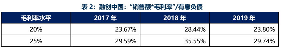 若以上述調整指標作為衡量基礎,分別以毛利率20%-25%對融創的權益口徑銷售額/有息負債指標進行換算,則可得下表。