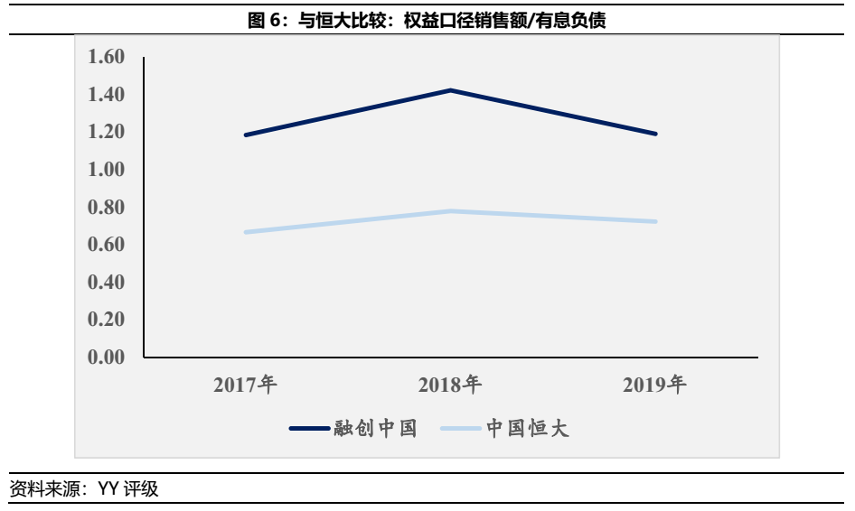 而從有息債務撬動權益口徑的銷售額來看,亦能發現恒大的債務效能明顯弱于融創。若再將權益口徑銷售額乘以25%(房企一般的毛利率水平)作為回款假設,則恒大的權益口徑毛利/有息負債僅為16%-19%之間,甚至不足19-20年恒大在外借款的非標利率水平。