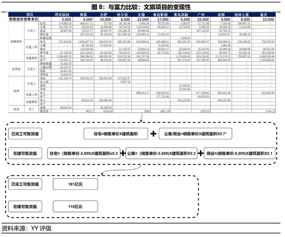 如圖8,將停車位視為0價值,并對相關物業去化速度進行系數折算(完工公寓/商業項目給予0.7折算;在建項目以住宅0.3、公寓0.2和商業0.1計算;住宅/公寓建筑成本為3,500元/平、商業業態為5,000元/平),13個項目短期內的已完工+在建項目可售貨值幾乎為300億元,提供融創后續運營建設重資產文旅業態有效支持,從而使融創與富力拉開差距。