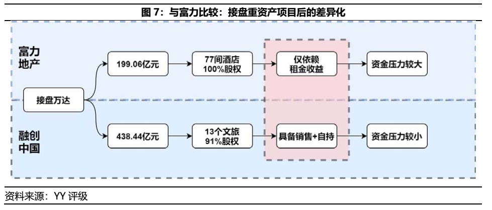 富力耗資199.06億元接盤了萬達77間酒店,融創則花費438.44億元接盤了13個文旅項目,他們自此有了不一樣的未來。自該收并購方案來看,富力看似狠賺老王一百多個小目標(最初酒店收并購方案的對價為300多億元)的接盤局下,最后卻沒能從重資產資金沉淀的泥淖走出,其中的癥結點仍在于重資產項目的配套住宅,即項目的可售/可變現程度。