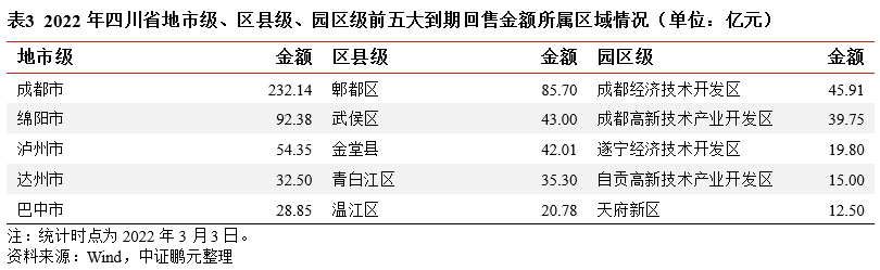 地市級平臺到期回售情況以成都、綿陽、瀘州為主,成都的區縣級平臺到期回售規模較為突出,園區級平臺到期回售主要分布在成都、遂寧、自貢