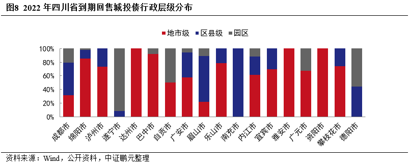 從行政層級來看,2022年四川城投償債主體主要為地市級及區縣平臺,到期回售規模分別為539.40億元和456.76億元,二者規模合計占比達68.47%,省級、園區到期回售規模較小,占比分別為16.43%和14.73%。