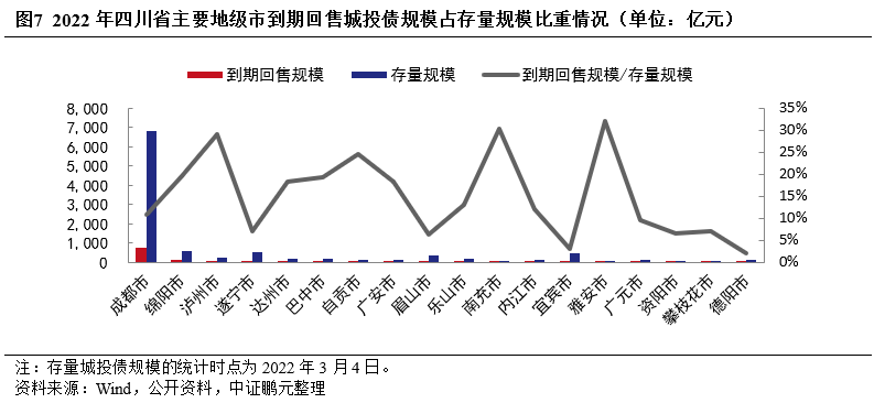 成都到期回售規模以及存量規模均較大,但鑒于較好的融資環境,到期回售壓力可控;綿陽、瀘州到期回售規模較大,存在一定的到期回售壓力