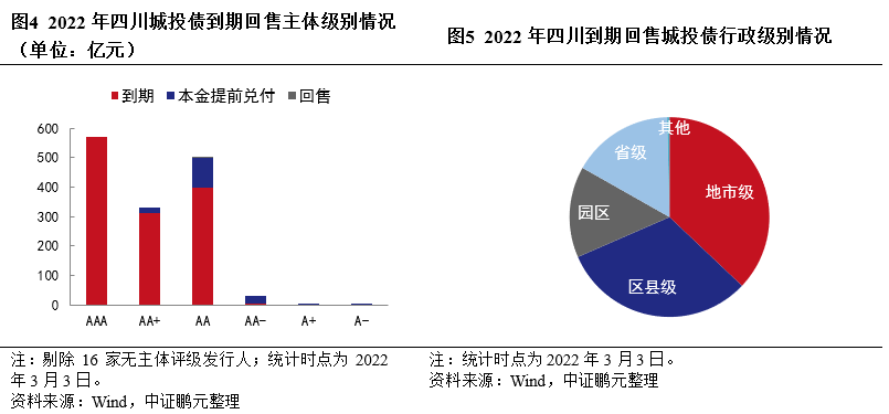 (1)2022年四川省城投債到期回售規模排名靠前,償債主體集中,以地市級和區縣級為主,中期票據規模最大。2022年四川城投債到期回售規模合計1,454.99億元,全國排名第六,此外,2022年尚有819.15億元的債券面臨回售,整體規模較大;AAA和AA級別到期回售規模均在500億元以上,地市級及區縣平臺占比達68.47%,中期票據規模為375.60億元,占比達25.81%。