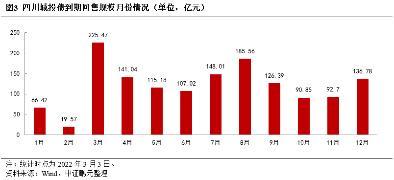 分月份來看,2022年四川城投債到期高峰期為3月份,當月到期總規模合計達225.47億元,占全年金額的15.50%;此外,8月份、7月份、4月份的到期總規模也相對較高,均超過140.00億元,年內2月份的到期總規模最低,僅19.57億元。