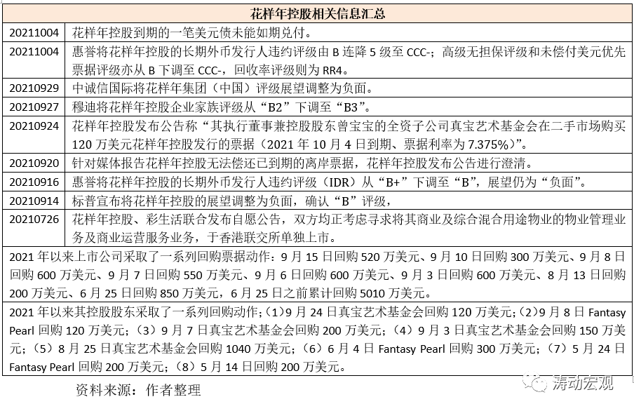 2、標普、惠譽、穆迪等三大國際評級機構(gòu)分別于9月14日、9月16日與9月27日相繼將花樣年控股的評級展望下調(diào)至負面。同時在花樣年控股宣布違約之前,惠譽將花樣年控股的長期外幣發(fā)行人違約評級由B連降5級至CCC-;高級無擔保評級和未償付美元優(yōu)先票據(jù)評級亦從B下調(diào)至CCC-。