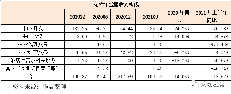 1、從花樣年控股的收入構(gòu)成來看,物業(yè)開發(fā)與物業(yè)經(jīng)營是兩大主要來源,二者合計貢獻了花樣年控股收入的95%以上,其中物業(yè)開發(fā)貢獻比例超過3/4,這意味著花樣年控股的收入來源仍主要依賴于地產(chǎn)開發(fā),酒店運營貢獻較少。