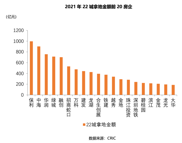 從22城拿地金額情況看,保利、中海、華潤拿地金額排名前三位,三家均為央企。拿地最多的10家房企中,7家為國企央企,3家為民企;拿地最多的20家房企中,11家是國企央企,9家是民企,國企央企占據(jù)較大優(yōu)勢(shì)。
