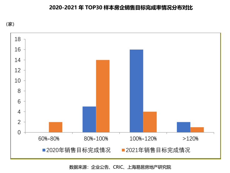 再放到TOP30樣本房企,目標(biāo)完成率平均值為96%,較上年下降13個(gè)百分點(diǎn);約8成的房企銷售未達(dá)標(biāo),僅5家房企完成了銷售任務(wù)。