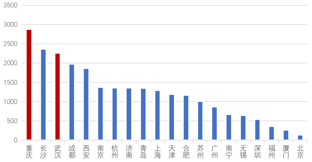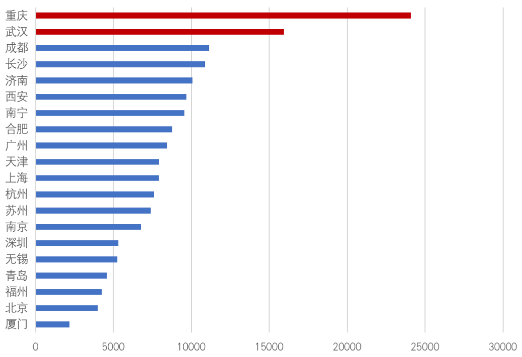 從近一年住宅用地成交規(guī)模來(lái)看,重慶、長(zhǎng)沙、武漢、成都等中西部城市表現(xiàn)依然強(qiáng)勁,重慶成交規(guī)模2877萬(wàn)平方米居首位。隨著項(xiàng)目的建設(shè)交付,我們相信,這些項(xiàng)目將在未來(lái)一年轉(zhuǎn)化為該城市企業(yè)的重點(diǎn)拓展對(duì)象。