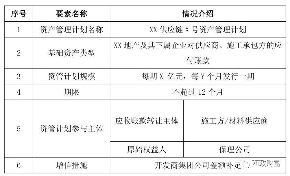 證券公司或其基金子公司作為管理人設立資產管理計劃,投資人通過資管計劃投資應收賬款,即上游供應商(債權人)對核心企業XX地產及其下屬公司(債務人)享有的應收賬款債權。應收賬款資產包括供應商因向核心企業及其下屬公司提供境內貨物買賣/服務貿易或境內工程承包/分包服務等而對核心企業及其下屬公司享有未到期應收賬款債權。