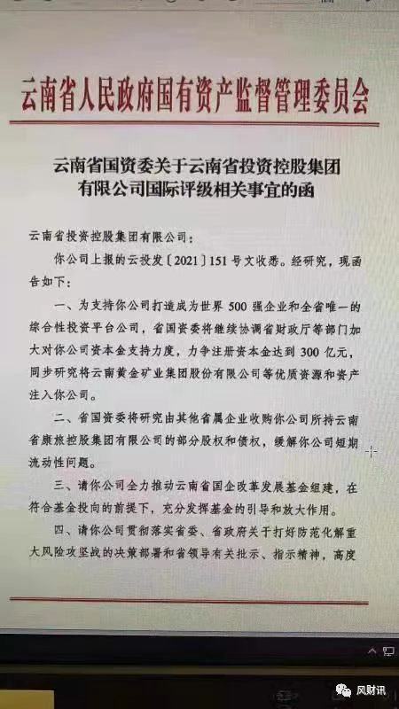 3月4日,風財訊獨家獲悉一份題為《云南省國資委關于云南省投資控股集團有限公司國際評級相關事宜的函》的文件。