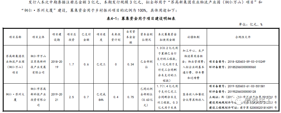 根據募集說明書披露的信息,本次中期票據的用途為用于“蘇高新集團農業物流產業園(銅仁萬山)項目”和“銅仁·蘇州大廈”建設。募投項目項目均位于貴州省銅仁市武陵山片區區域發展與扶貧攻堅示范區,全部用于支付與鄉村振興相關的鞏固拓展扶貧攻堅成果項目的剩余工程款項。