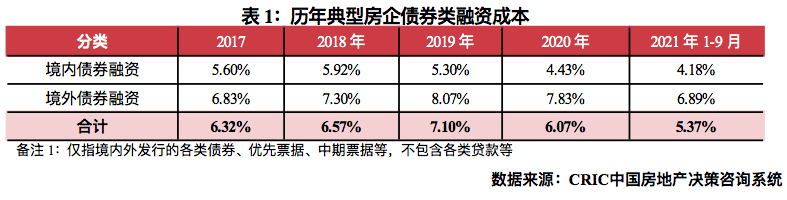 融資成本:2021年截至9月100家典型房企新增債券類1融資成本5.37%,較2020年下降0.70個百分點,其中境外債券融資成本達6.89%,下降0.94個百分點,境內債券融資成本4.18%,較2020年下降0.26個百分點。單月來看,9月房企融資成本5.55%,環比上升0.61個百分點,同比上升0.16個百分點。其中境外融資成本7.32%,環比下降0.49個百分點,持續維持高位;境內融資成本3.49%,環比上升0.19個百分點。房企融資利率在2.65%-12.50%間,境內發行債券有旭輝、遠洋、越秀等企業發行,利率基本在5%以下,而境外發債的企業多家企業的債券發行融資成本達12.50%,企業融資持續分化。