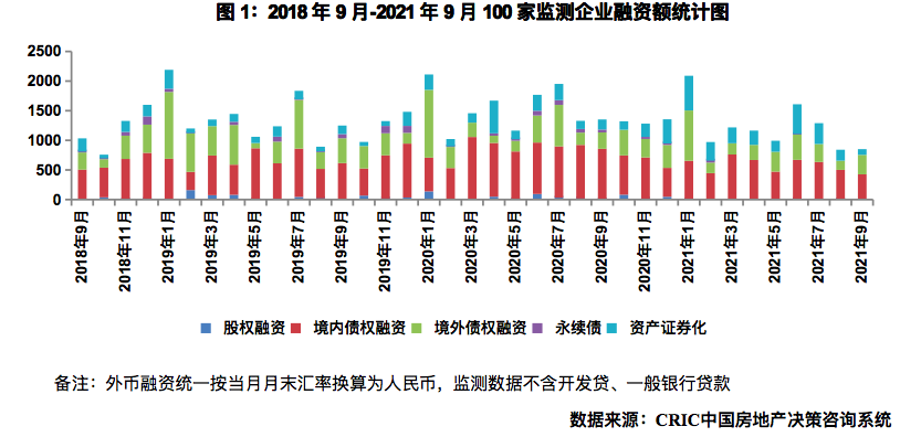 融資總量:2021年9月100家典型房企的融資總量為851.22億元,環比上升1.2%,同比下降37.1%,融資量維持不到千億元,持續走低。自2020年11月份以來,房企的單月融資連續11個月均呈現同比下降,而由于房企積極降杠桿,融資方面“量出為入”甚至用自有資金進行債務償還,單月低融資量或將持續成為常態。從融資結構來看,境內債權融資426.23億元,環比下降14.9%,同比下降50.1%;境外債權融資328.46億元,環比上升112.8%,同比上升18.9%,隨著近期境內房地產動蕩預期見底,境外融資買賣有所恢復;本月資產證券化融資96.53億元,環比下降47.9%,同比下降43.3%。