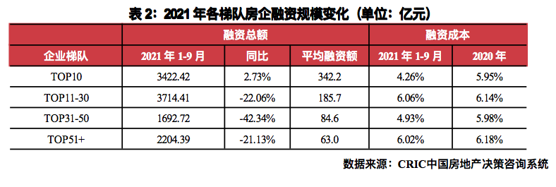 企業表現:本月融資總量最高的企業為招商蛇口,融資總量約85.70億元,主要是為發行了合計30億元的超短融和為多家子公司進行了擔保;此外碧桂園發行了一筆78.30億港元的換股債券,融資量較高。從企業梯隊來看,2021年1-9月平均額最大為TOP10房企,平均融資額342.2億元,同時實現融資總額同比上升,是唯一一個同比上升的梯隊;TOP31-50梯隊融資總額同比降幅最大,降幅達到42.34%。成本來看,4個梯隊均較2020年全年下降,其中TOP10梯隊的融資成本最低,為4.26%,下降幅度為1.69pct,降幅最大。