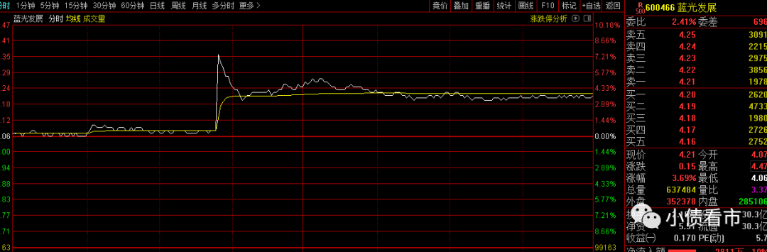 受此消息影響,4月22日早盤藍光發(fā)展盤中直線拉升并觸及漲停,隨后股價震蕩回落,成交量明顯放大,收盤報4.21元,漲幅為3.69%。