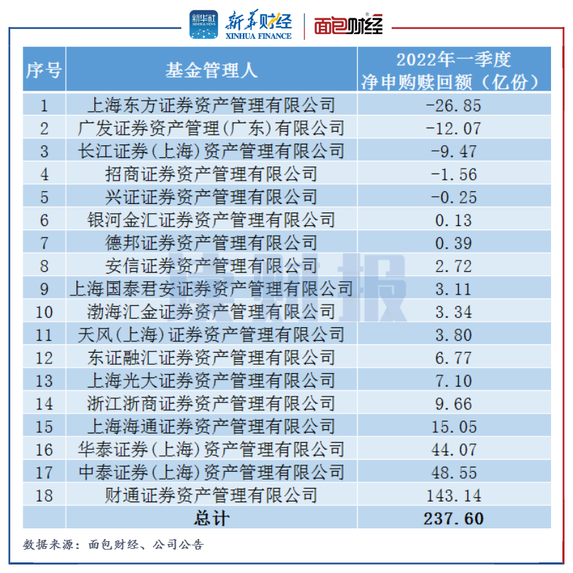 面包財經和新華財經對18家券商資管子公司旗下產品一季報的統計發現,2022年一季度,由券商資管子公司管理的500余只開放式公募基金產品份額凈申購合計237.6億份,其中總申購16032.58億份,總贖回15794.98億份。
