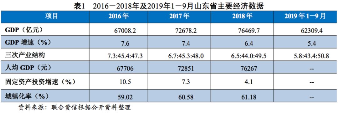 從經濟運行方面看,山東省近三年經濟保持穩定增長,產業結構更趨優化,整體經濟環境向好。2016-2018年,山東省分別實現地區生產總值67008.2億元、72678.2億元和76469.7億元,經濟規模在全國處于上游水平;增速分別為7.6%、7.4%和6.4%,2018年增速低于全國平均水平,增速有所放緩;三次產業結構由2016年的7.3:45.4:47.3調整為6.5:44.0:49.5,第三產業占比不斷增長,產業結構更趨優化。固定資產投資方面,2018年,山東省固定資產投資(不含農戶)比上年增長4.1%,增速低于全國增速1.8個百分點,增速較2017年的7.3%有所放緩,三次產業投資構成為1.7:39.5:58.8,服務業投資比重比上年提高10.3個百分點。全年房地產開發投資7553.0億元,比上年增長13.8%。2019年1-9月,山東省實現地區生產總值62309.4億元,按可比價計算,增長5.4%,仍低于全國平均增速;其中,三次產業結構調整為5.8:43.4:50.8,服務業占比同比提高1.5個百分點。2019年前三季度山東省經濟運行繼續保持平穩發展勢頭。