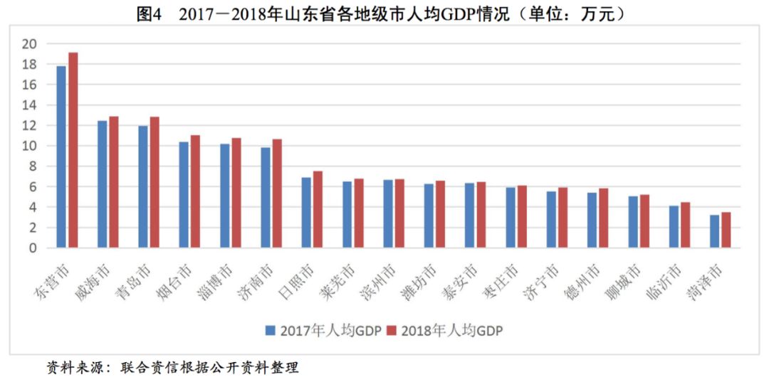 從山東省地級市GDP方面看,青島市的GDP規模和增速處于領先地位,2017-2018年,青島市GDP分別為11037.28億元和12001.50億元,GDP增速分別為7.5%和7.4%,2018年青島市GDP占全省的比重為15.69%。濟南市和煙臺市的GDP規模僅次于青島市,2018年,上述兩個地級市的GDP規模分別為7856.56億元和7232.58億元;濰坊市和淄博市的GDP規模均超過5000億元;GDP規模在5000~3000億元的地級市有濟寧市、臨沂市、東營市、泰安市、威海市、德州市、聊城市和菏澤市;日照市、濱州市、棗莊市和萊蕪市經濟實力較弱,GDP均不到3000億元??傮w看,山東省各地級市經濟分化程度較高,青島市的GDP規模及增速處于絕對領先地位,濟南市、煙臺市、濰坊市和淄博市經濟體量其次,濱州市、棗莊市、日照市和萊蕪市經濟體量小。從人均GDP來看,2017年和2018年東營市、青島市和威海市的人均GDP處于省內最高,而聊城市、臨沂市和菏澤市規模最小,人均GDP差異主要為地方經濟實力及人口規模等因素所致。