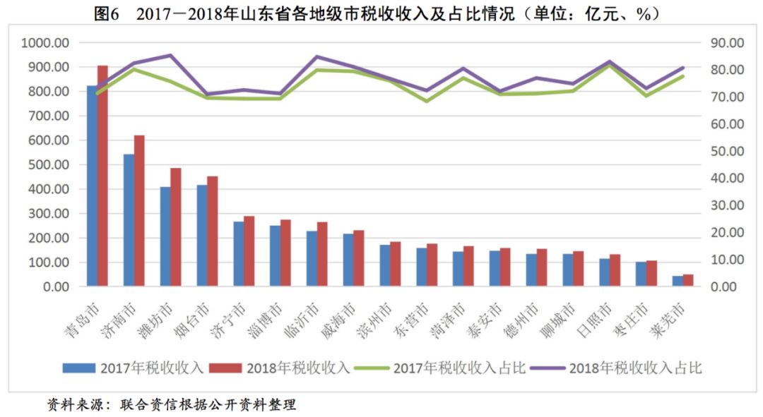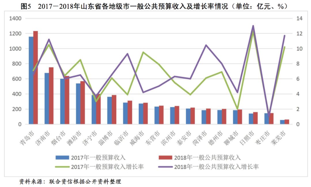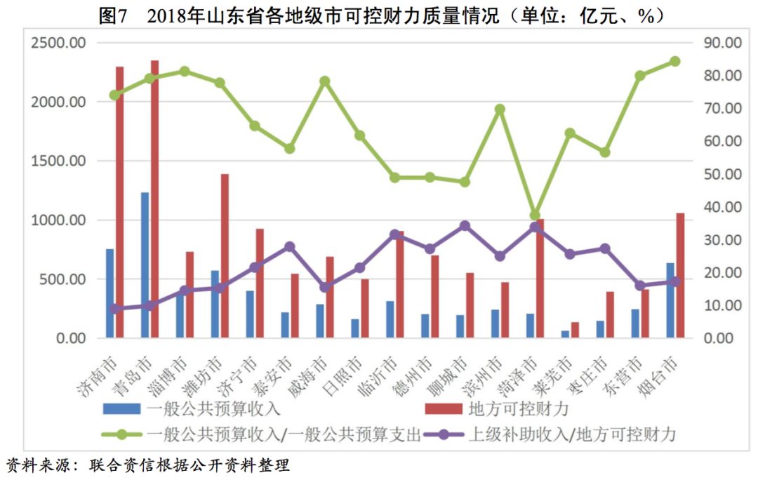 山東省各地級市的財政實力分化較為明顯,其中青島市和濟南市的財政實力最強。近年來,山東省各地級市一般公共預算收入質量較好,部分地級市政府債務負擔較重。