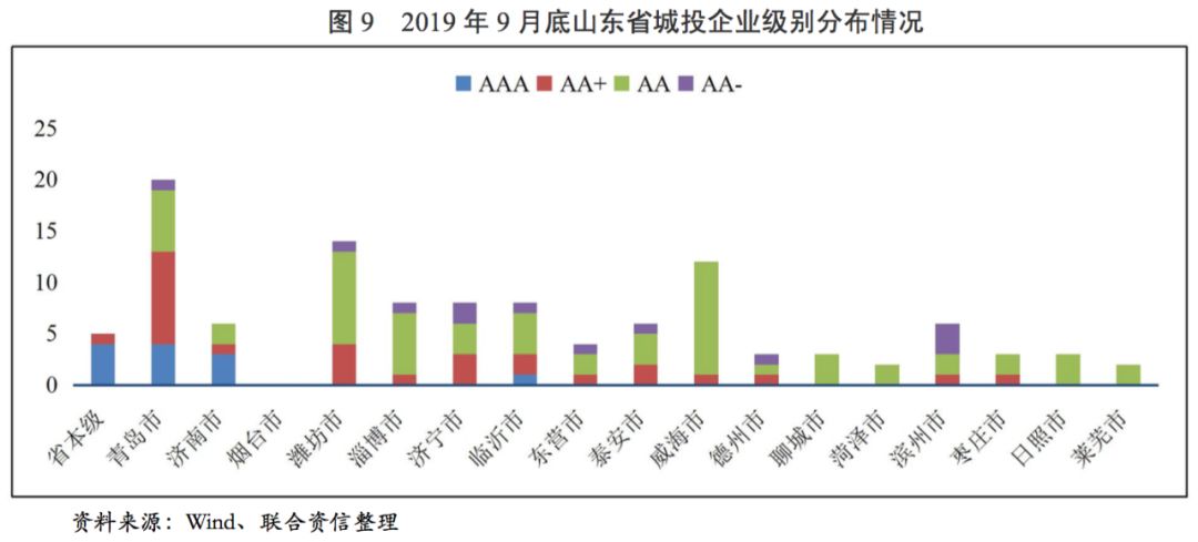 截至2019年9月底,山東省有存續債且有主體級別的城投企業共112家[6]。其中,省本級城投企業5家,地級市本級城投企業26家,地級市下轄區級城投企業30家,園區城投企業13家,縣級市/縣城投企業38家;主體級別為AAA的城投企業12家,主體級別為AA+的城投企業27家,主體級別為AA的城投企業61家,主體級別為AA-的城投企業12家。分地級市來看,青島市的城投企業個數最多,達到20家,其次為濰坊市(14家)、威海市(12家)、臨沂市(8家)、淄博市(8家)、濟寧市(8家)、濟南市(6家)和濱州市(6家),其余地級市平臺數量相對較少。從級別分布看,受區域經濟及財政實力影響,AAA城投企業主要集中于省本級及經濟財政實力強的青島市和濟南市,其余地級市中只有臨沂市有1家AAA城投企業,但臨沂市與其他AAA城投企業所屬區域的經濟和財政實力的差距較大。除煙臺市、聊城市、菏澤市、日照市和萊蕪市以外,其余地級市均有AA+城投企業,煙臺市無存續級別的城投企業,聊城市、菏澤市、日照市和萊蕪市城投企業最高級別為AA,級別為AA-的城投企業全部位于區縣、高新區及經開區。