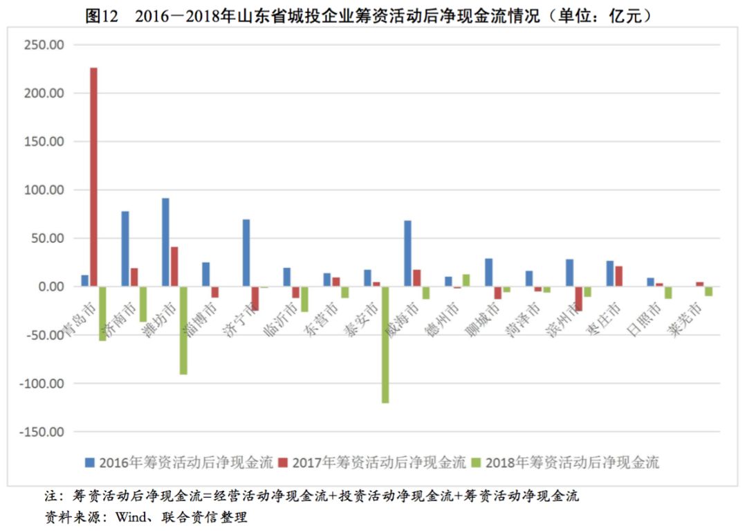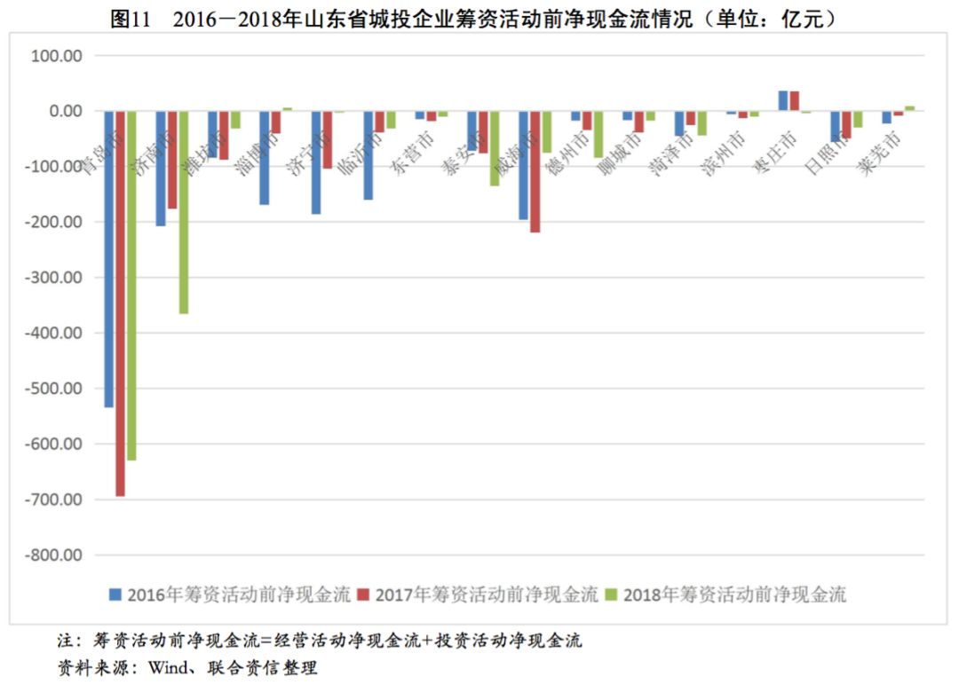 從各地級市城投企業籌資活動現金流狀況看,2016-2018年,青島市、濟南市和德州市城投企業籌資活動現金流入波動上升,年均復合增長率分別為13.80%、11.08%和65.37%,其余地級市城投企業籌資活動現金流入均呈波動下降趨勢,山東省大部分地級市城投企業籌資力度有所下降。反觀籌資活動現金流出情況,近三年除臨沂市、東營市、泰安市和棗莊市城投企業籌資活動現金流出有不同程度下降外,其余地級市城投企業籌資活動現金流出均有所增長。受流入減少、流出增多趨勢的共同影響,山東省大部分地級市城投企業籌資活動凈現金流均大幅下降,但經濟實力較強的青島市和濟南市仍保有較大規模的籌資活動現金凈流入。從籌資活動前凈現金流看,2018年除淄博市和萊蕪市為凈流入以外,山東省其余各地級市均為凈流出態勢,其中青島市、濟南市和泰安市資金缺口最大。從籌資活動后凈現金流來看,2016-2018年,山東省地級市城投企業籌資活動后凈現金流整體呈下降趨勢,其中青島市、濟南市、濰坊市、泰安市和臨沂市在2018年降幅明顯,上述地級市的城投企業融資壓力明顯加大。