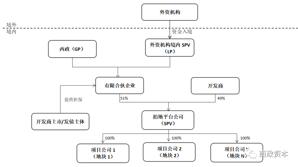 從當前的市面融資情況來看,2020年11月房企境內外發(fā)債規(guī)模環(huán)比增長率超過了50%,部分中小房企境外發(fā)債利率突破了年化14%,另外2021年也將迎來還債高峰期。從房企的存量發(fā)債情況來看,目前總體上是借新還舊的多(尤其是境外發(fā)債)。從新增融資的路徑來看,房企2021年的增量融資主要得轉入兩個方向:第一個是真股融資或明股實債類融資,這是在“三道紅線”下房企表內債壓降背景下的必然選擇;第二個權益類融資,比如房企的商業(yè)、辦公類物業(yè)所涉的資產收益權、租金收益權融資,房企的工程材料應付賬款、購房尾款、物業(yè)管理應收賬款等對應的供應鏈ABS或其他收益權類產品融資等。需要注意的是,目前上交所、深交所對于ABS產品的發(fā)行只允許存量發(fā)行,增量相對困難,但是保交所目前發(fā)行前述產品還存在增量的空間。此外,北金所的債權計劃對于發(fā)行主體不要求強制外部評級、資金用途和使用期限靈活、項目準入相對寬松、業(yè)務辦理流程簡單,目前已逐漸受到房企的青睞。除上述主流融資方式外,境外融資將成為不少房企更好的融資選擇,比如外資比較喜歡的土地競拍保證金資金池融資業(yè)務,房企境外發(fā)行的364天的美元債,帶外資招商任務的土地款融資等(指山東、江蘇等地為代表的FDI類融資,具體可參見下述融資架構)。