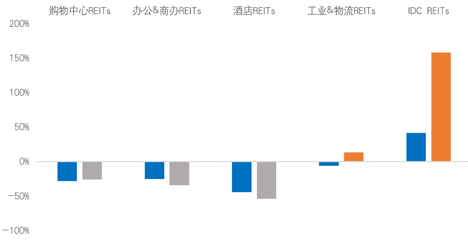 在新加坡市場上市的吉寶IDC REITs作為唯一以數據中心為底層資產的REITs今年表現搶眼,頗受市場投資者追捧,較年初已實現超40%漲幅,REITs溢價目前已超150%。而折溢價本身正體現著REITs對于不動產市場的價格發現功能,除IDC REITs外,恢復情況較好的工業/物流REITs也實現了折溢價的“由負轉正”。