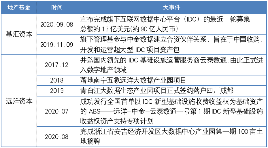 9月8日,基匯資本宣布完成旗下互聯網數據中心平臺(IDC)的最近一輪募集,總額約13億美元(約90億人民幣),本輪募資旨在與中國IDC開發商和運營商合作投資IDC項目組合。除了基匯資本,國內的地產私募基金在數據中心方面也早有布局。