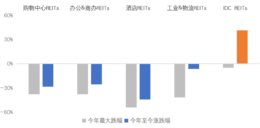 3月黑天鵝事件下,隨著美股的多次震蕩,新加坡&香港市場REITs行情在3月23日來到今年最低點,其中酒店類REITs跌幅最大,跌幅超5成,以數據中心為底層資產的IDC REITs跌幅最小僅有4.8%。