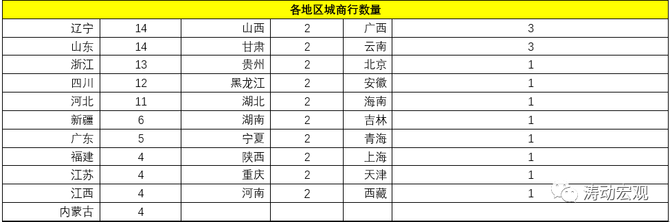 (3)另有10個地區分別擁有2家城商行,8個地區分別擁有1家城商行。