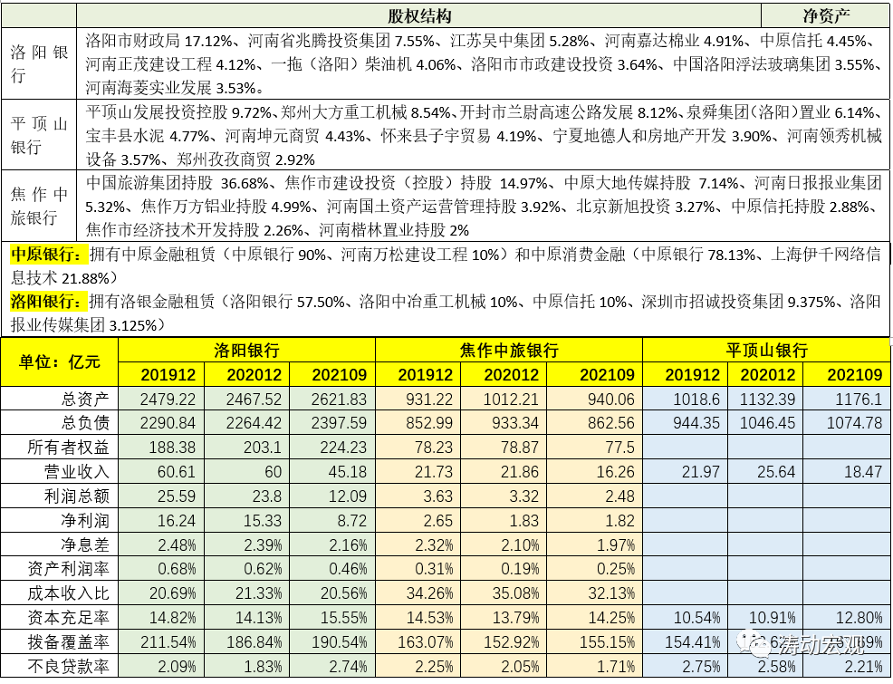從公開披露的信息來看,三家被合并銀行的股權關系比較復雜,民營成分較濃,同時其資產質量均比較一般。例如截至2021年9月,洛陽銀行、焦作中旅銀行與平頂山銀行的不良貸款率分別為2.74%、1.71%和2.21%,而撥備覆蓋率僅分別為190.54%、155.15%和161.69%,整體實力偏弱。