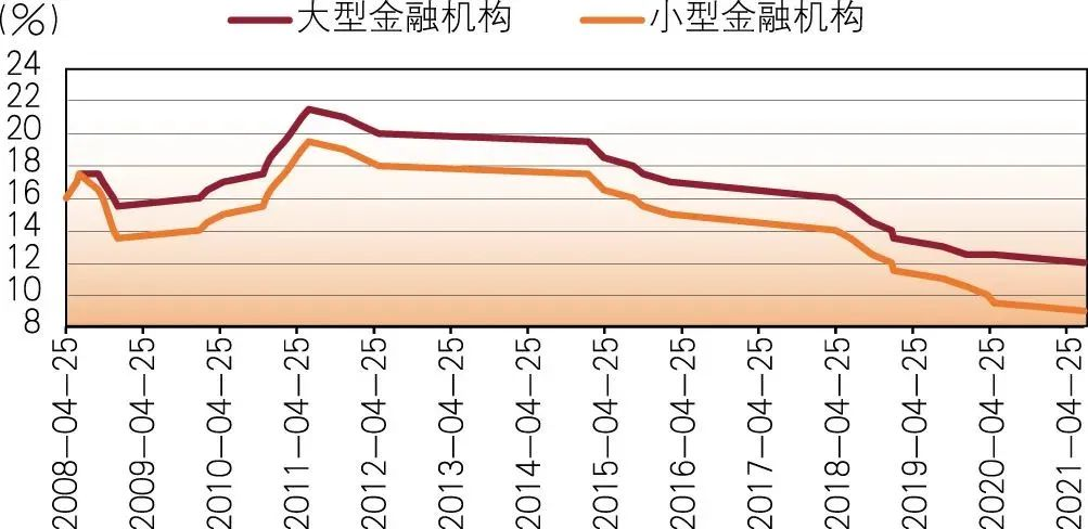 2021年,中國人民銀行加大了信貸結構優(yōu)化力度,利用定向降準實現金融服務普惠性。其中,中小金融機構法定存款準備金比率已經降至了9%,相較于之前19%的高點,下降了10個百分點,較大型金融機構低了3個百分點,為中小微企業(yè)、“三農機構”、個體工商戶創(chuàng)造了良好的流動性環(huán)境。