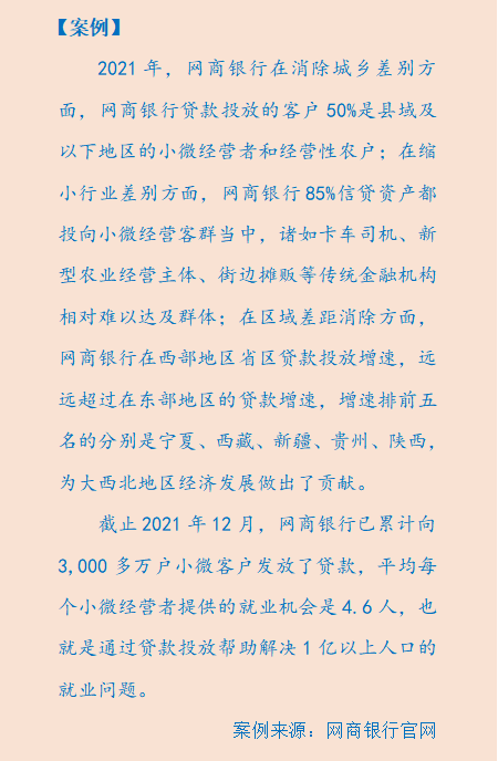 2021年,互聯網銀行通過大數據和互聯網技術,利用遠程信息收集、網上申請、網上審核和線上投放資金服務,一定程度上解決抵押擔保缺乏、經營風險成本高昂、資金投放粗放問題,讓地處偏遠地區(qū)的小微企業(yè)、個體工商戶也能夠享受到有溫度的網絡金融服務。