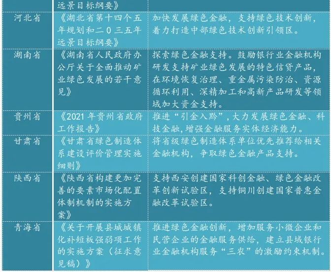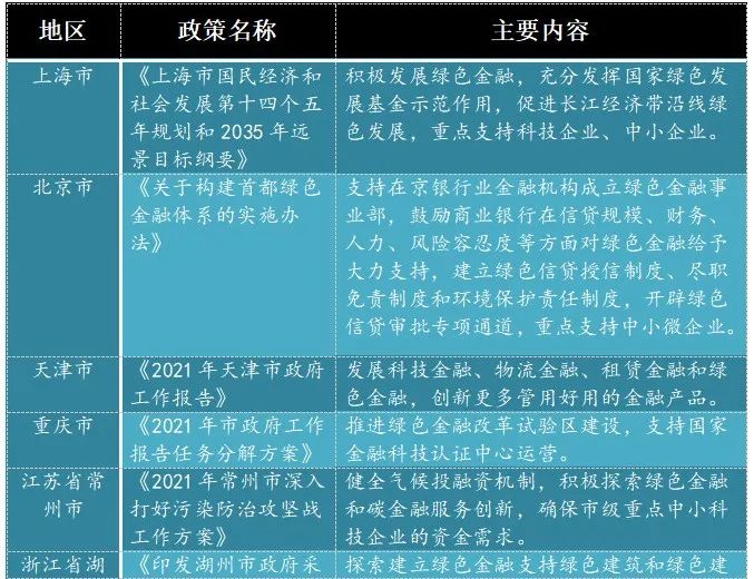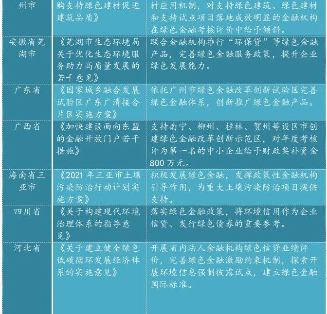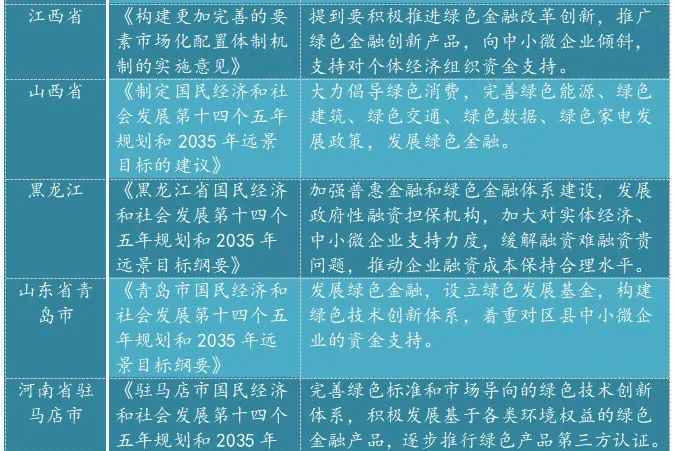 從2021年開始,我國部分省市出臺一些列政策推動綠色金融產業(yè)的發(fā)展,圍繞鄉(xiāng)村振興、精準扶貧、三農雙創(chuàng)等方面開展金融產品和服務方式創(chuàng)新,將綠色金融理念與標準延伸至小微企業(yè)貸款、涉農貸款、返貧致貧、雙創(chuàng)貸款等普惠金融業(yè)務,逐漸將“協調、綠色、共享”理念在普惠金融中落實,滿足不同群體的差異化需求。