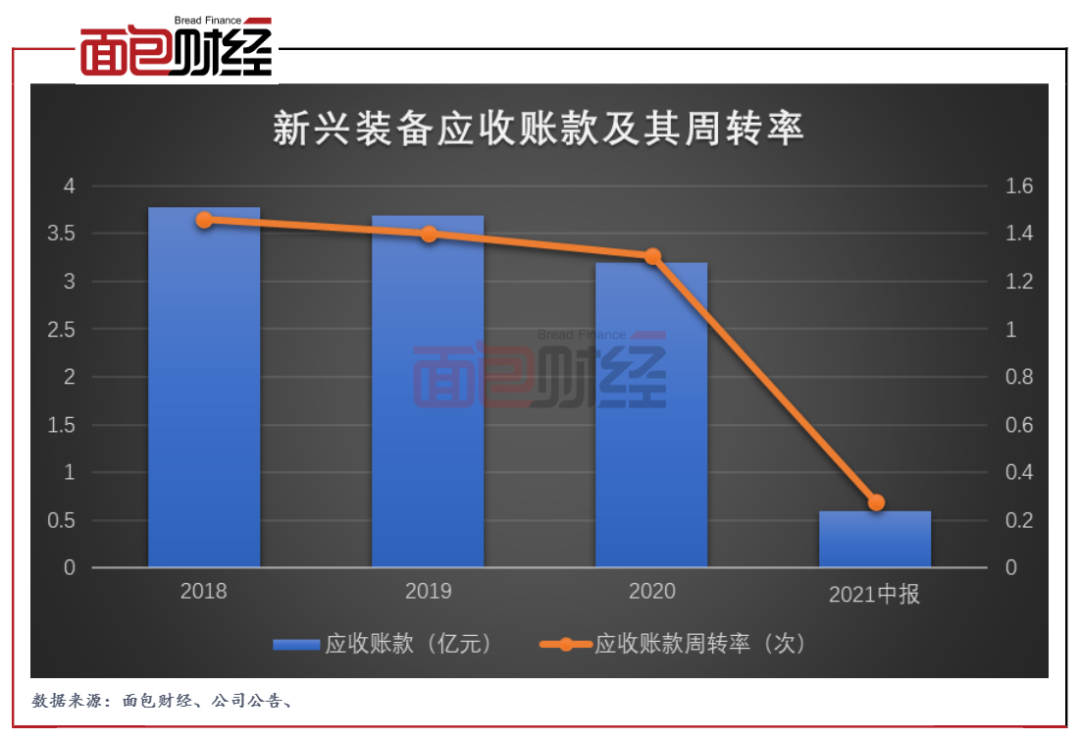近年來,新興裝備的應收賬款雖呈下降趨勢,但值得注意的是應收賬款周轉率也在逐年下降。截至6月末,公司應收賬款周轉率為0.28次,較上年末下降1.03次。