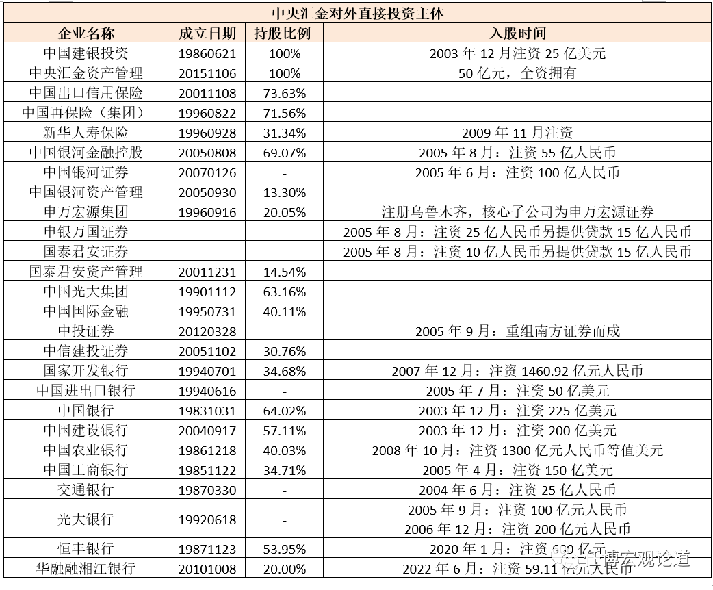 (一)2003年12月16日,中央匯金成立(注冊資本8282.09億元),成立時注冊資本為3724.65億元,其主要職能是代表國家行使對重點金融企業的出資人的權利和義務。其中,中央匯為中投的全資子公司,而后者被稱為中國版的主權財富基金,是國資委的全資子公司。