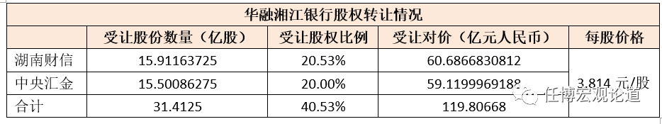 2022年6月9日,港股上市公司中國華融(2799.HK)發布公告稱,其于當日與湖南財信金融控股集團有限公司(下稱湖南財信)、中央匯金投資有限責任公司(下稱中央匯金)簽署《金融企業非上市國有資產交易合同》,前者以人民幣119.80668億元的對價(每股價格為3.814元/股)向后者轉讓中國華融所持有的華融湘江銀行40.53%股權(31.4125億股)。