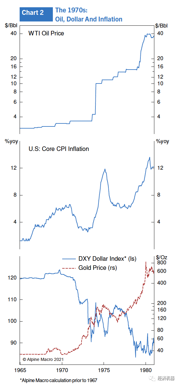 Alpine Macro在很多研究報(bào)告中呼吁這種擔(dān)憂過(guò)分了。我們一起看看20世紀(jì)70年代的通脹經(jīng)歷,當(dāng)年所發(fā)生的事情無(wú)疑是《華爾街日?qǐng)?bào)》提到的“大時(shí)代轉(zhuǎn)折點(diǎn)”。我相當(dāng)清楚地記得那一幕,1960年代我曾在加拿大銀行工作,當(dāng)時(shí)的情況為1970年代的大通脹打下了基礎(chǔ)。