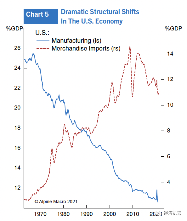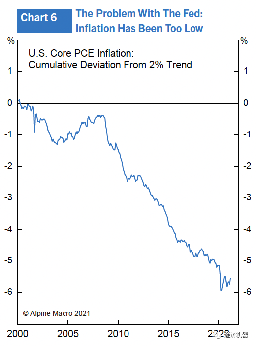 (2) 當(dāng)時(shí)制造業(yè)幾乎占美國(guó)經(jīng)濟(jì)的四分之一;現(xiàn)在僅為10%。當(dāng)前,世界正進(jìn)入由技術(shù)提供方和使用方共同主導(dǎo)的“第四次工業(yè)革命”,一場(chǎng)完美的技術(shù)創(chuàng)新風(fēng)暴正在形成,并將在未來(lái)幾年加速。世界經(jīng)濟(jì)的快速數(shù)字化、機(jī)器人技術(shù)、人工智能和5G通信本質(zhì)上是導(dǎo)向通縮的,這在很大程度上解釋了美聯(lián)儲(chǔ)為什么十多年來(lái)未能將通脹率提高到目標(biāo)水平的原因(圖6)。