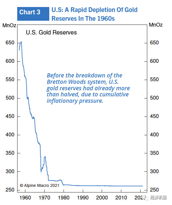 圖3顯示了1960年以后美國(guó)的黃金儲(chǔ)備。黃金儲(chǔ)備下降的早期階段反映了戰(zhàn)后中央銀行黃金儲(chǔ)備的再平衡,但在1965年通脹壓力加速后,黃金庫(kù)存的下降急劇惡化,僅在1970-1971年經(jīng)濟(jì)衰退期間短暫緩解。這是金本位發(fā)出的經(jīng)典警報(bào)信號(hào):是時(shí)候收緊貨幣政策了。到了1971年8月,美國(guó)不得不做出一個(gè)決定——緊縮以維持黃金與美元的聯(lián)系,或者讓美元浮動(dòng)以擺脫這種約束。隨著政治上的重大左傾和高失業(yè)率,當(dāng)局對(duì)緊縮沒(méi)有興趣。尼克松總統(tǒng)選擇將美元與黃金脫鉤。